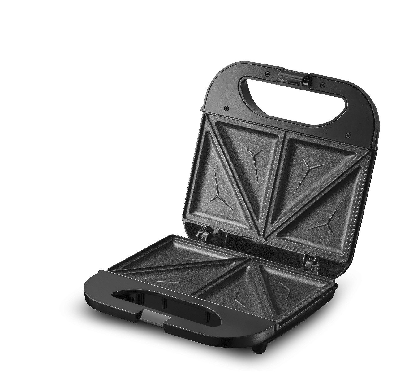 The uniquely shaped plates are designed to seal and cut two sandwiches into four perfectly toasted triangles.